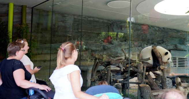 Riesenpanda Jiaoqing spielt im Berliner Zoo.