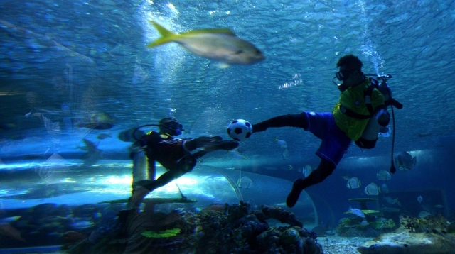 Taucher spielen am 14. Juni 2018 Fu?ball im Haichang Jingsha Ocean Park in Yantai in der ostchinesischen Provinz Shandong (Xinhua / Tang Ke).