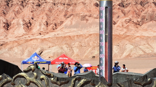 In Chinas autonomen Gebiet Xinjiang erreichten die Temperaturen am Sonntag und Montag 72 Grad Celsius. In dem Tourismusgebiet Huoyanshan (Flammenberg) blies die Hitzewelle den Besuchern ins Gesicht.